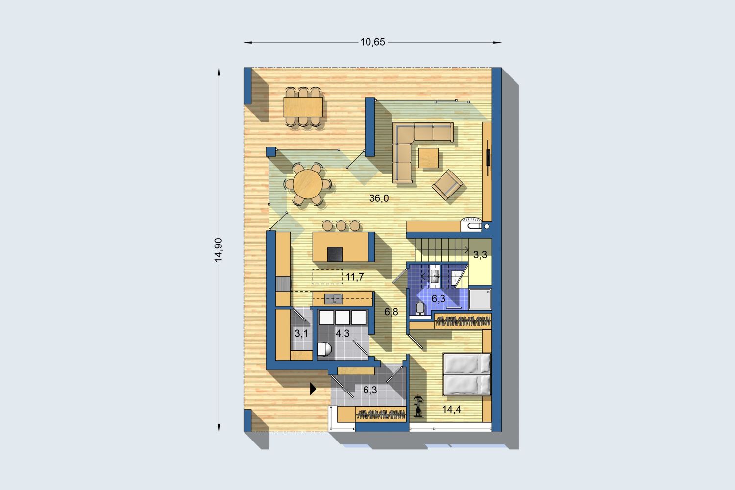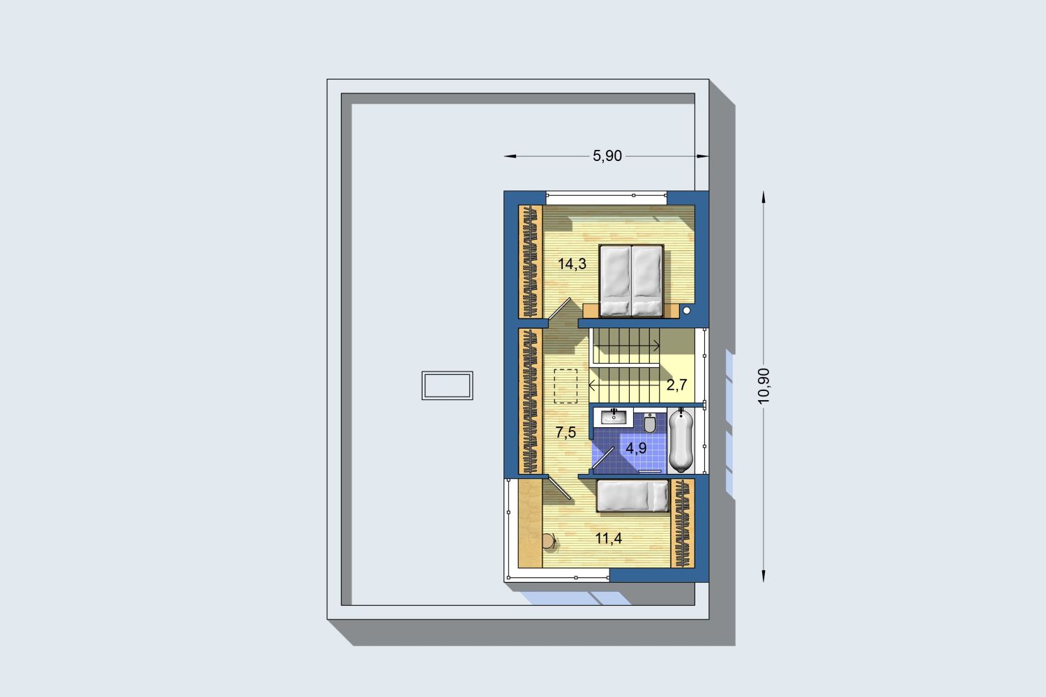 Poschodový dom s nadčasovým vilovým dizajnom, ktorý nevyžaduje veľa miesta na pozemku a spĺňa nároky modernej rodiny. Srdcom domu je veľkorysý obytný priestor s voľnou dispozíciou, s veľkými zasklenými plochami a prekrytou terasou. Previs strechy po celom obvode zabraňuje letnému prehrievaniu priestoru a zároveň nebráni preslneniu v zime. Rozmiestnenie izieb umožňuje variabilné využívanie – rodičovská spálňa môže byť umiestnená na prízemí alebo na poschodí. Dom má dostatok úložných priestorov a dobre využitú dispozíciu.