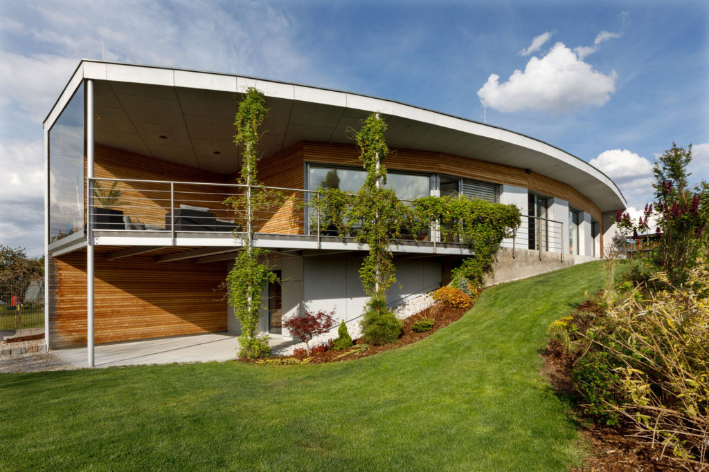 „Zelený“ tehlový dom s rozsiahlymi zasklenými plochami. Do oblúka prehnutá krivka celej južnej strany ho vťahuje do okolitej krajiny a poskytuje výhľady na tri svetové strany. Pretiahnutý obdĺžnikový pozemok, ktorý má na šírku sotva 16 metrov, inšpiroval architekta k atypickému objektu v tvare prehnutého luku, vďaka ktorému nemajú obyvatelia domu výhľady len ploché, ale doslova trojrozmerné. Celá južná stena domu je oblúková, najväčšiu dynamiku zaoblenia dosahuje oblúk v obývacej izbe. Obytné podlažie nadväzuje na úroveň parcely pri príjazde, prechádza do krytej terasy, ktorá už je stĺpmi vynesená nad úrovňou záhrady a chránená sklenou stenou. Za zádverím je chodba a z nej sú prístupné všetky miestnosti, denná časť s kuchyňou, jedálenským kútom a zasklenou obývacou izbou smerujúcou na juh, aj ďalšie dve izby, toaleta, kúpeľňa a šatňa. Spálňa má vlastnú kúpeľňu so saunou.