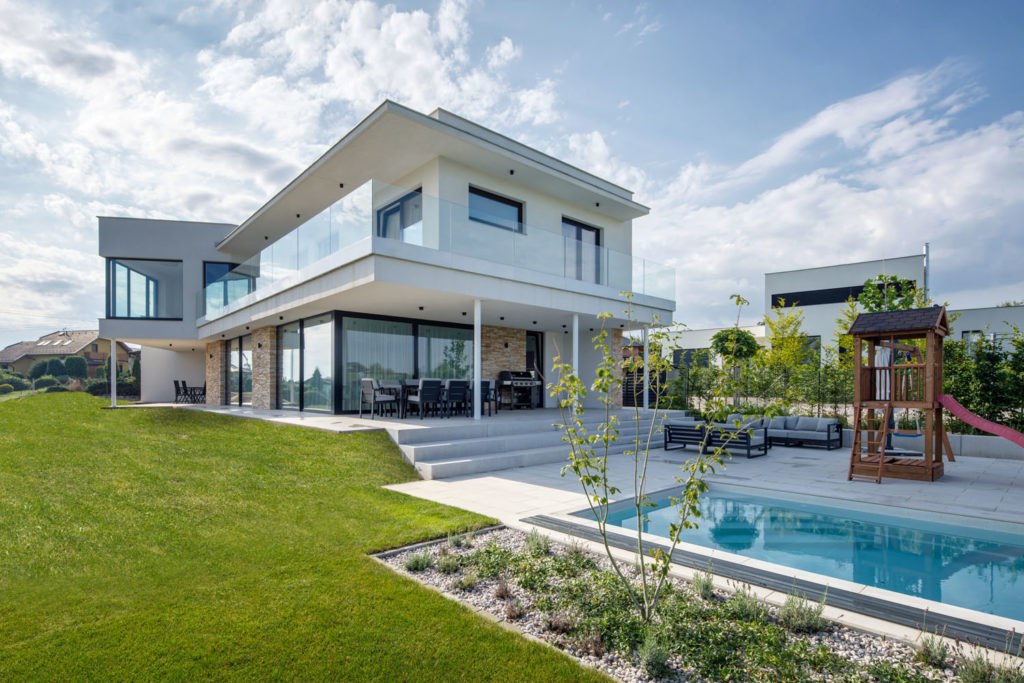 Moderný, štýlovo čistý, murovaný a poriadne presklený dom s plochou strechou. Dvojpodlažný tehlový dom sa rozkročil cez dva pozemky a aj vďaka maximálne presklenému prízemiu a svahovitému pozemku opticky takmer levituje nad krajinou. Aj sklené zábradlie na hornom poschodí s minimom rušivých predelov pomáha naplniť názov tunajších končín, ktorým sa hovorí na Krásnej vyhliadke podľa rovnomennej ulice. Má tvar zalomeného obdĺžnika s predsadeným horným poschodím a plochými strechami, jednoduchý vzhľad objektu dotvára biela fasáda s čiastočným obložením lomovým kameňom. Dispozične je dom koncipovaný ako 5 + kk so spoločenskou časťou na prízemí, ktorú tvorí priestranná obývačka s kuchyňou, a so súkromným zázemím na poschodí (spálňa, pracovňa, dve detské izby a posilňovňa).