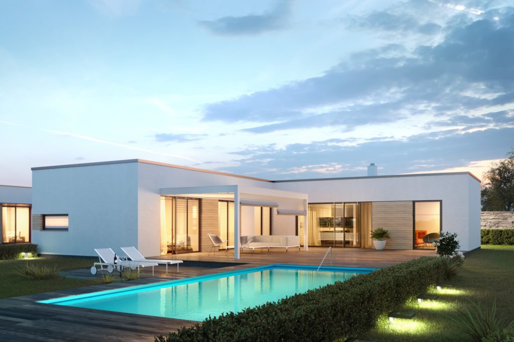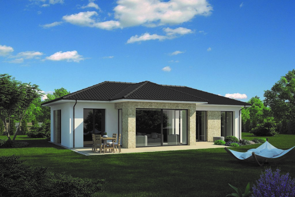Elegantný a čistý bungalov s prehľadnou dispozíciou. Zaujme možnosťou výstupu do záhrady z akejkoľvek obytnej miestnosti. Hlavnými výhodami domu je prepojenie exteriéru s interiérom a dobré presvetlenie interiéru. Oboje je docielené pomocou francúzskych okien, ktoré sú umiestnené vo všetkých miestnostiach. Pôsobí ľahko a sviežo.