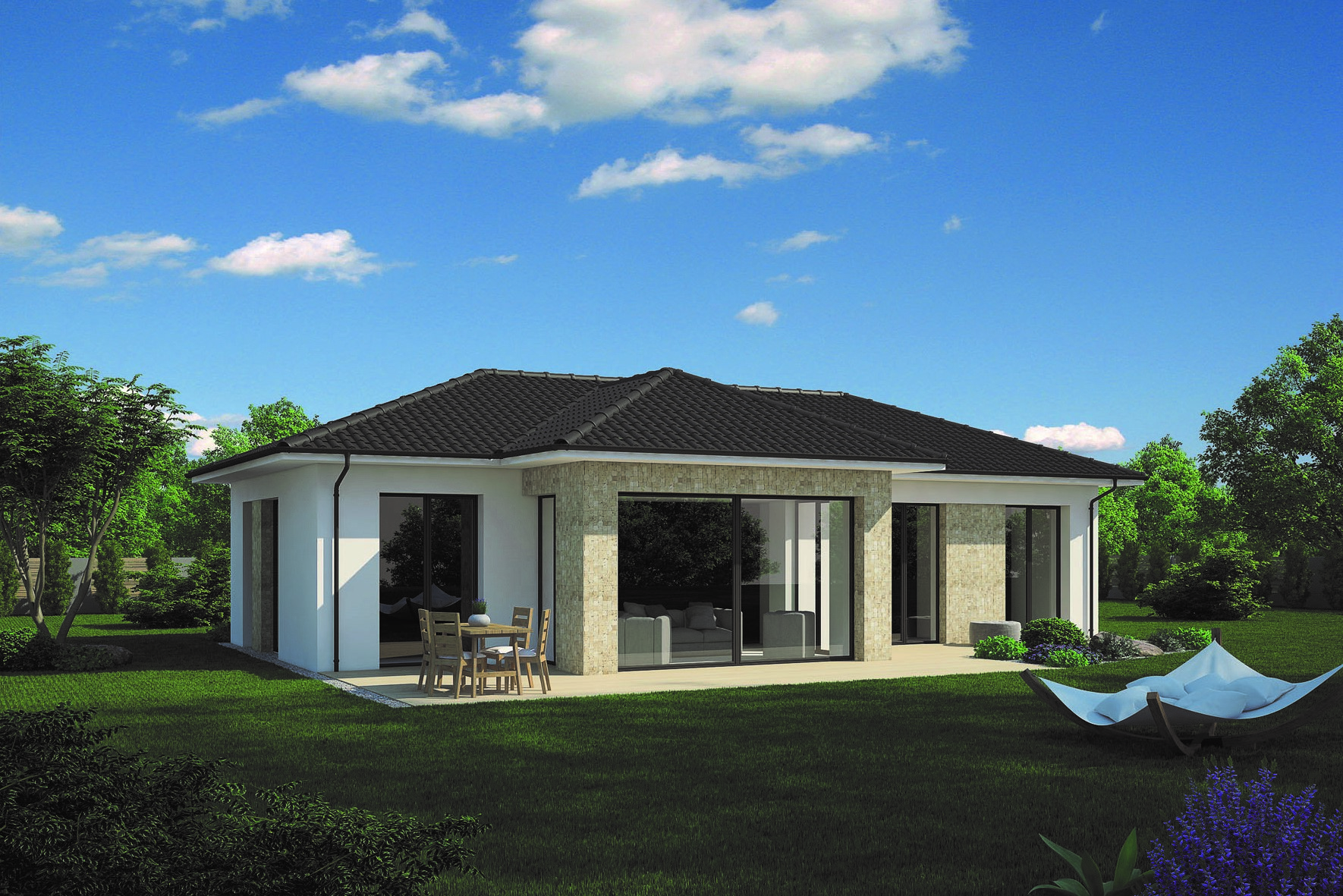 Elegantný a čistý bungalov s prehľadnou dispozíciou. Zaujme možnosťou výstupu do záhrady z akejkoľvek obytnej miestnosti. Hlavnými výhodami domu je prepojenie exteriéru s interiérom a dobré presvetlenie interiéru. Oboje je docielené pomocou francúzskych okien, ktoré sú umiestnené vo všetkých miestnostiach. Pôsobí ľahko a sviežo.