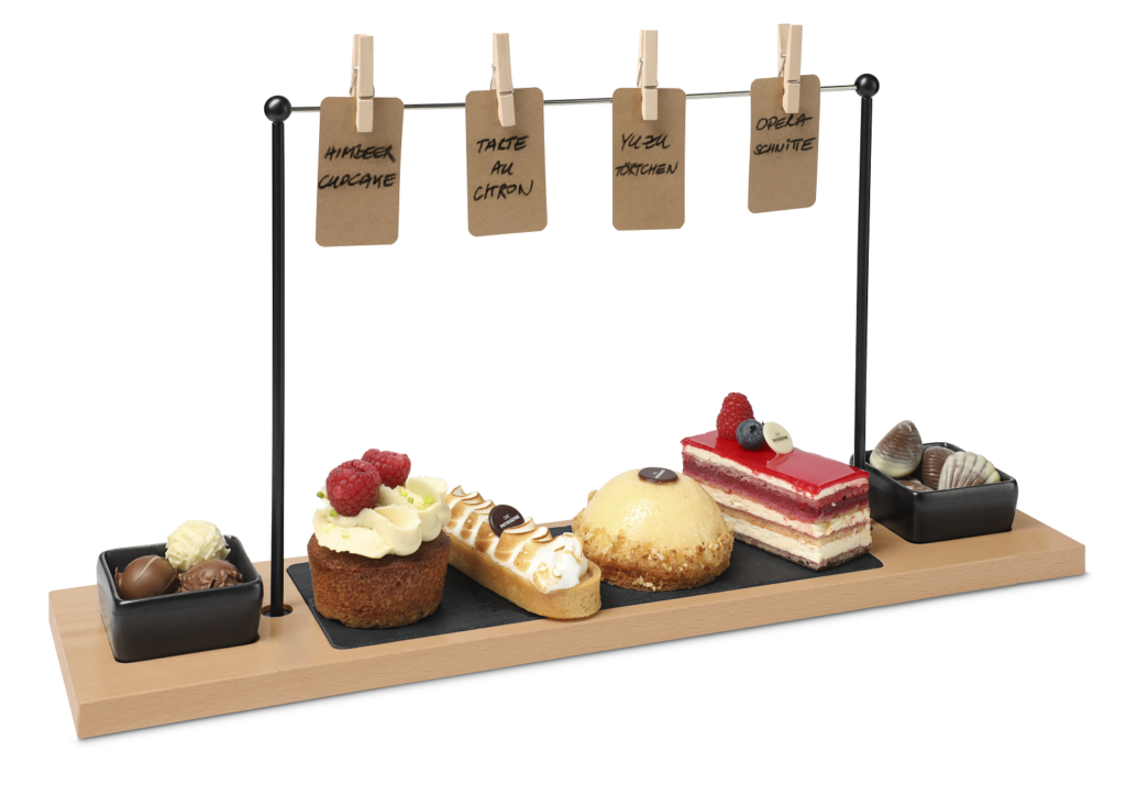 Sada na servírovanie z kvalitného bukového dreva s bridlicovou doskou a miskami na dipy zaujme možnosťou pripnúť kolíčkami či už menovky, názvy chuťoviek alebo ich zloženie.