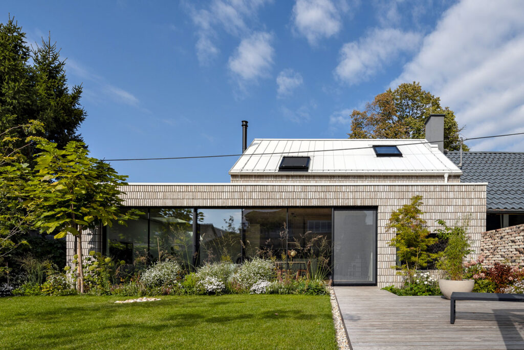 Zaujímavými prvkami prístavby, ktorá rozširuje dennú časť domu o komfortnú obývačku, je zelená strecha so svetlíkom a veľké presklené plochy. Tie dennú zónu priamo prepájajú so záhradou a terasou. V podkroví, ktoré vzniklo zdvihnutím úrovne hrebeňa strechy, sa nachádza nočná časť tvorená detskými izbami a multifunkčným priestorom. Dostatok svetla sem prinášajú strešné okná VELUX s trendovým čiernym rámom.