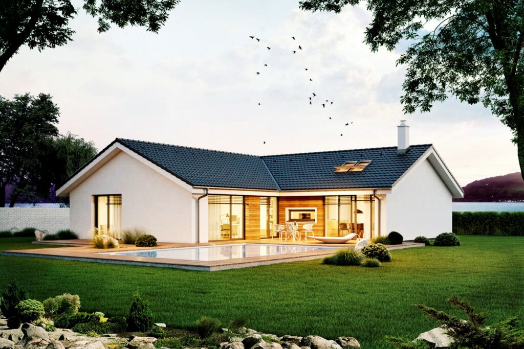 Pôdorys tvaru L v kombinácii s klasickou strechou a modernými prvkami je obľúbenou voľbou pri výbere bývania. Bočné steny bez okien do obytných miestností dovoľujú umiestniť tento dom aj blízko k hraniciam pozemku, zmestí sa teda aj na užší pozemok aj napriek veľkorysej úžitkovej ploche.