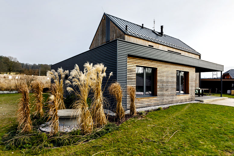 Dominantu domu s prevetrávanou fasádou z lát zo sibírskeho smrekovca predstavuje jeho priečelie s vysokými oknami. Fasádu domu tvorí okrem lát antracitový trapézový plech. Okná aj vstupné dvere sú hliníkové, tiež s antracitovým povrchom, takisto aj všetky klampiarske prvky.