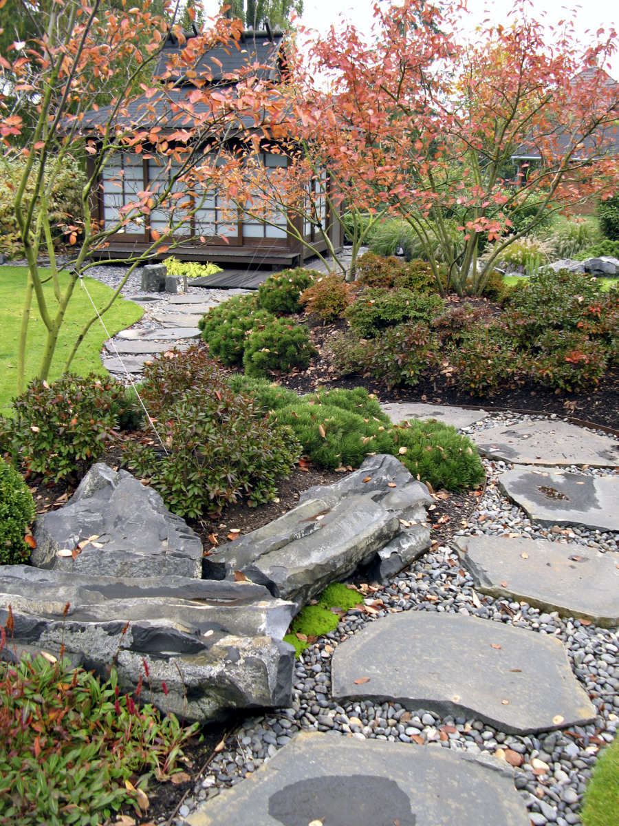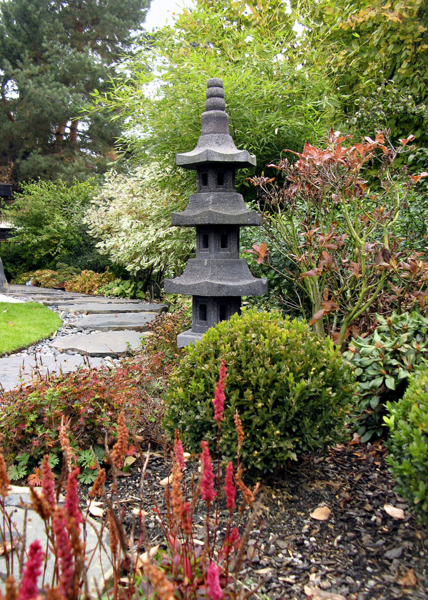 Japonské prvky prevažujú, hoci artefakty sa vo väčšine prípadov zhotovili v Európe. Nájdete tu miniatúry horských štítov a kopcov, nechýba suchý potok, znázorňujúci hlavnú cestu záhradou. Originálnym nápadom sú azalkové vyvýšené záhony, predstavujúce ostrovy v šírom mori a čadičové solitéry, za ktorými sa pri čajovom domčeku schovávajú malé bonsaje. Atmosféru dotvárajú japonské lampy a flóra, ktorá je schopná v daných podmienkach prežiť.