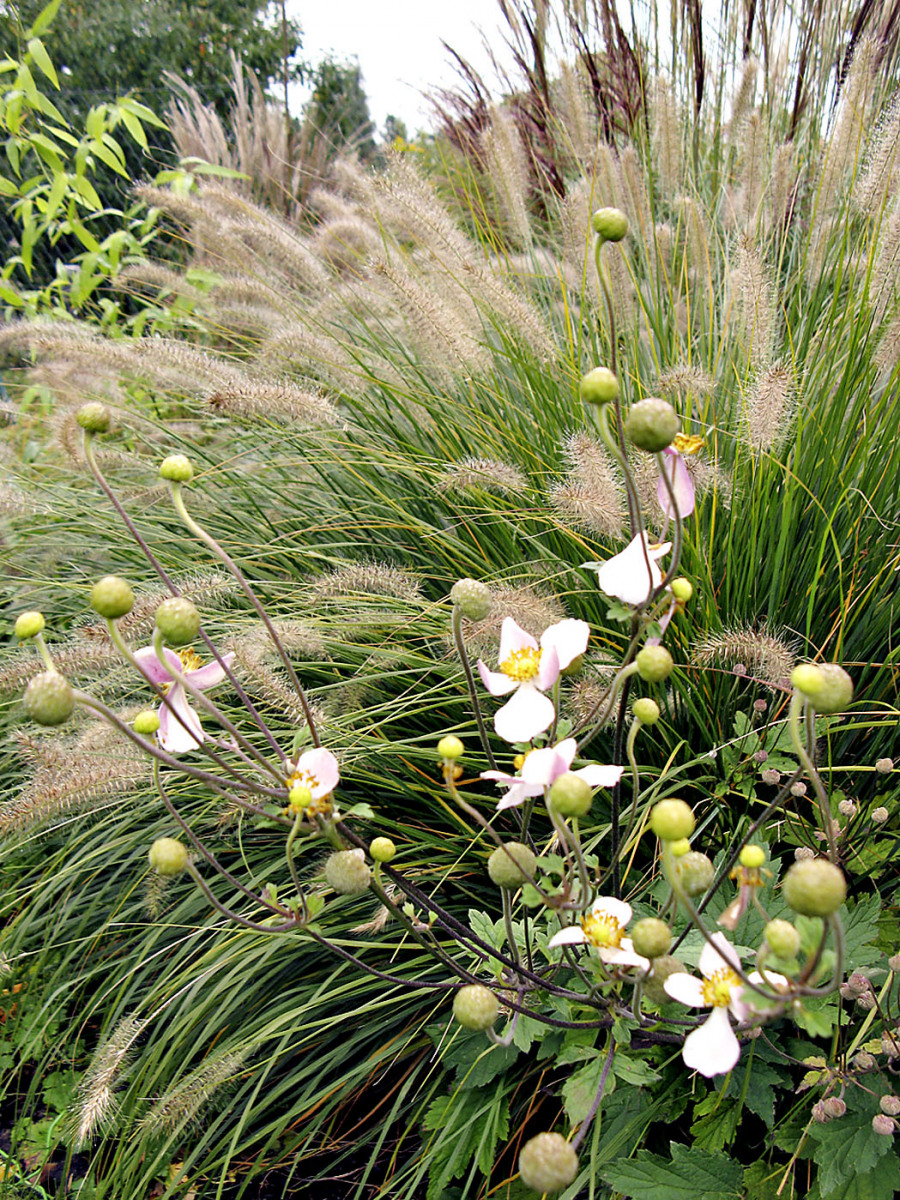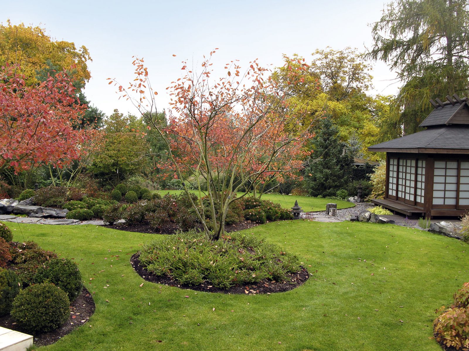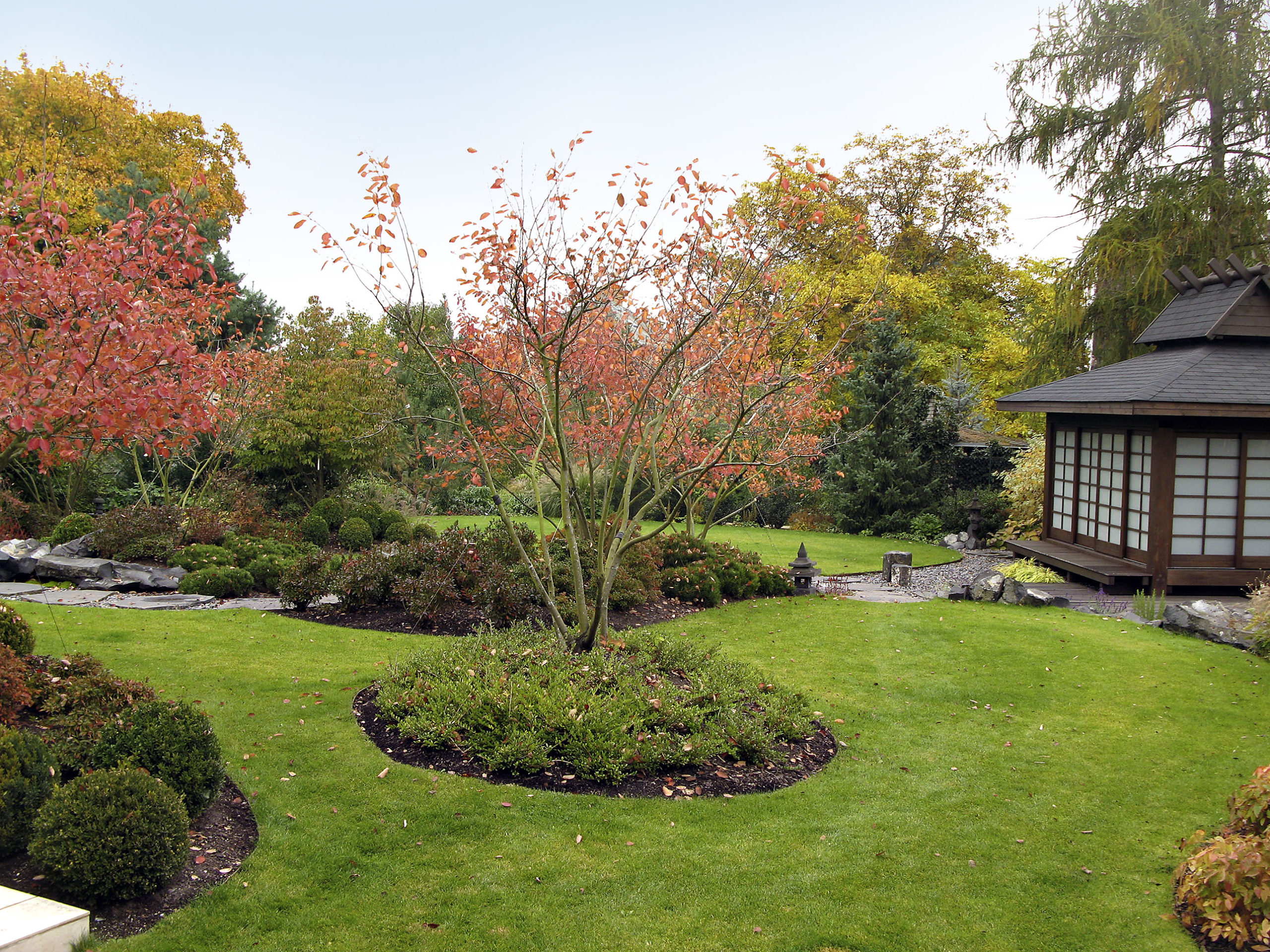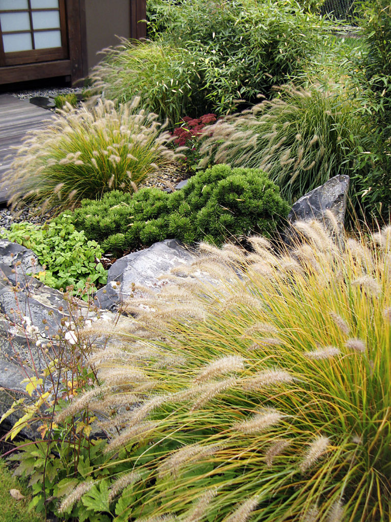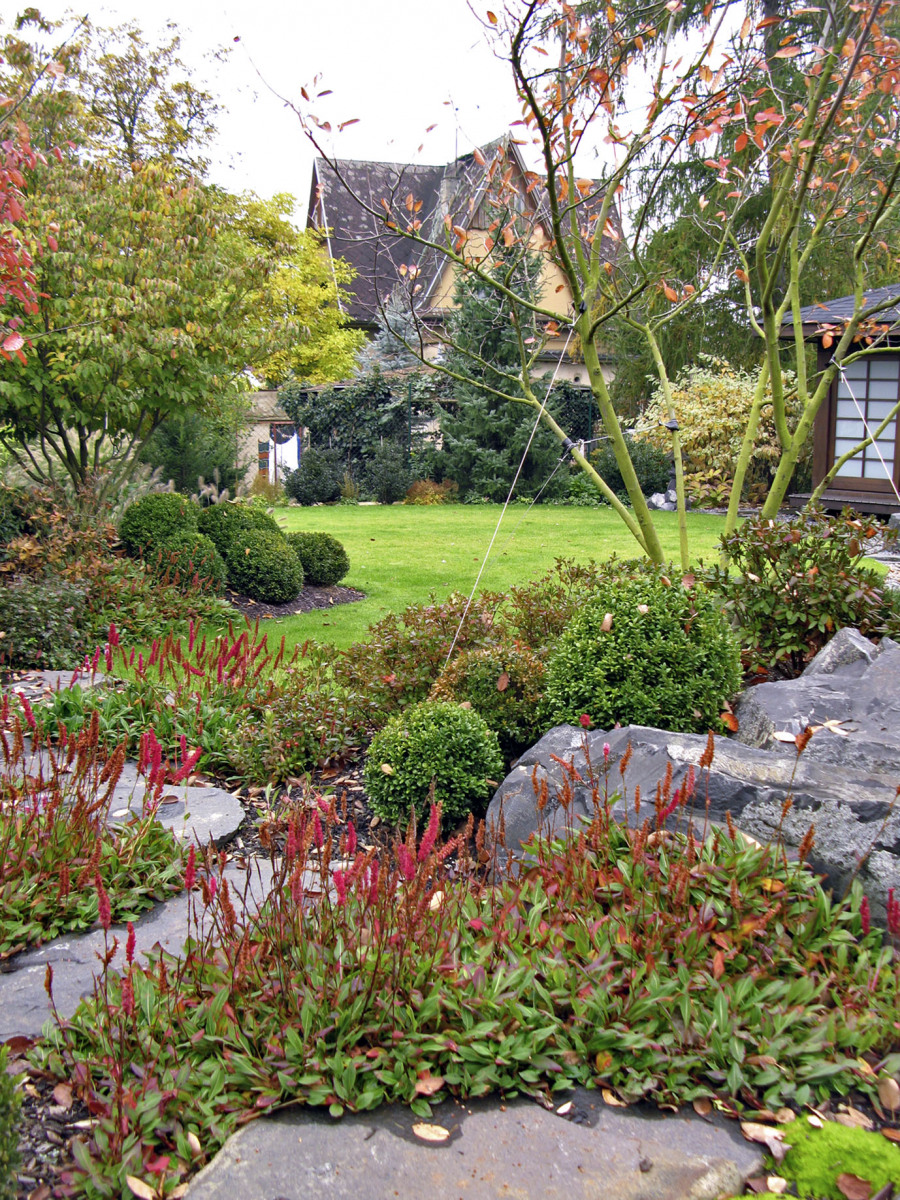 Kopce sa postupne, takmer kaleidoskopicky, skladajú do farieb a sú zaujímavé v každom ročnom období. Nikdy sa nepozeráte cez prázdny trávnik, ale cez niekoľko farebných kopcov a kulís, aby ste v spodnej časti zbadali štýlový červenohnedý čajový domček. Jeho okolie zdobia rôzne kombinácie okrasných tráv – ozdobnica čínska (Miscanthus sinensis), kostrava (Festuca), bezkolenec (Molinia), perovec červený (Pennisetum setaceum) a ďalšie, vrátane zriedkavej japonskej trávy (Hakonechloa macra). Dôstojné majiteľove zázemie, kde sa venuje bonsajovej záľube, je diskrétne ukryté trávami v kombinácii s buxusmi a svíbmi krvavými (Cornus sanguinea). Kamenné sokle zdobia bonsaje, ktoré sú najväčšou pýchou majiteľa záhrady.