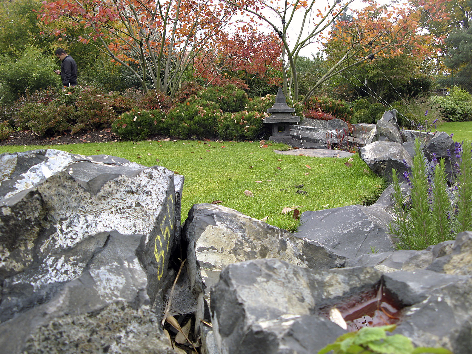 Na pozemku s veľkosťou asi 1 500 m2 prevažovala orná pôda. Nebolo treba rozsiahle úpravy. Dovezená hlina poslúžila na modeláciu terénu pre azalkové ostrovy. Využila sa na úpravu záhonov a na usadzovanie kameňov. Nachádza sa tu celkom 25 solitérnych kamenných blokov. Ploché polygóny z čierneho čadiča sa využívajú na cestnú sieť. Hlavná esovitá cesta je chrbticovou osou celej záhrady. Kratšie cesty sú vysypané kamennou drvinou.