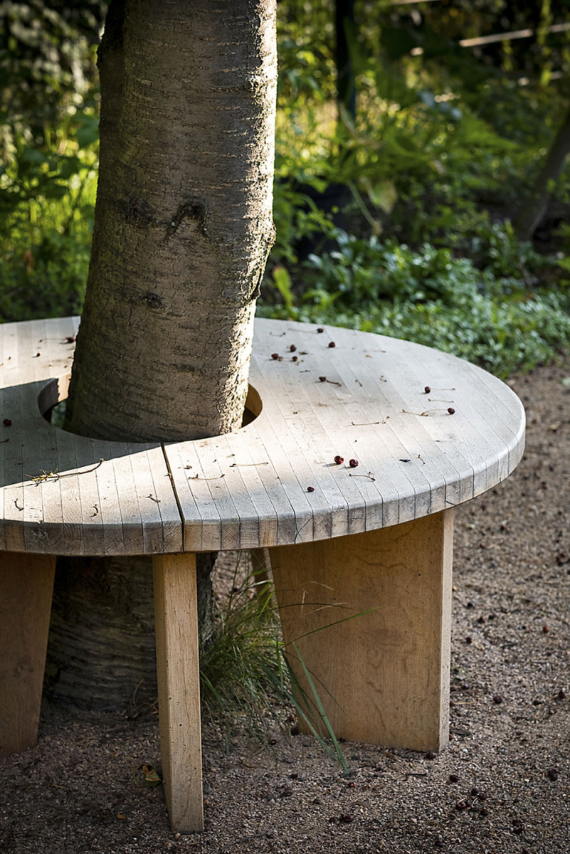 Za domom sa rozprestiera ďalší hájik s posedením a okrasnými stromami, ktoré tvoria dominantu pri pohľade z okna pracovne. Z čistinky vedie chodník výsadbami pod rozvetvenými kmeňmi liesok do hlavnej pobytovej časti záhrady. Nasvietenie kmeňov stromov, skupín či solitérov, cesty alebo výsadby dodáva záhrade tajomný nádych a spríjemňuje pobyt aj pohyb po záhrade po zotmení.