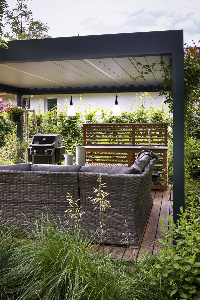 „Pergola je umiestnená v západnom cípe druhej trávnatej plochy tak, aby sa pohľadovo prepájala s terasou domu. Zároveň je obklopená porastom kríkov a stromov, ktoré ju obaľujú a vytvárajú príjemnú atmosféru na posedenie. Konštrukcia je jednoduchá kovová v antracitovej farbe, bez zastrešenia, tienená len plachtou, ktorá poskytuje príjemný tieň a zároveň zachytí ľahký letný dáždik. Pod pergolou je umiestnený jednoduchý pult s úložným priestorom na prípravu pokrmov,“ vysvetľuje Ferdinand Leffler koncept chráneného posedenia v západnej časti záhrady. V blízkosti pergoly sú umiestnené vyvýšené zeleninové záhony, ktoré navrhli zo smrekovcových fošní. Bylinky na dochutenie grilovaných pokrmov sú teda doslova na dosah ruky. V najzápadnejšom cípe záhrady umiestnili kompostér, ktorý so záhonmi prepája cestička vo výsadbe, lemovaná ovocnými kríkmi – malinami, černicami, kríkovými čučoriedkami a lesnými jahodami.
