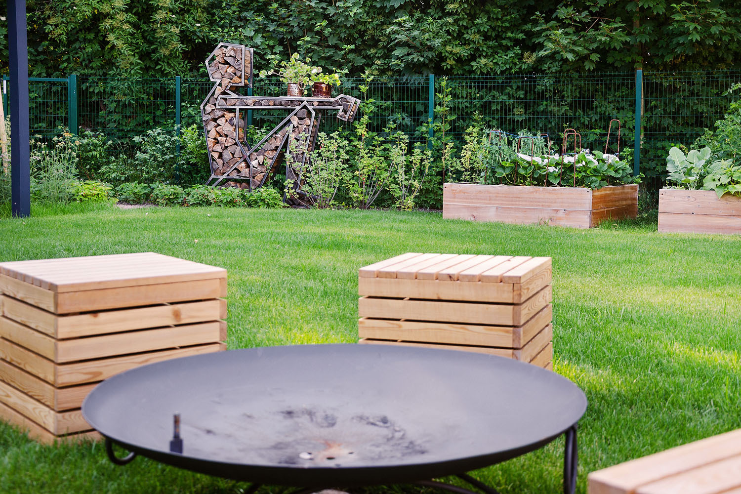 Ku chvíľam rodinnej pohody neodmysliteľne patrí posedenie pri otvorenom ohni. Do trávnatej plochy v blízkosti pergoly preto záhradní architekti navrhli prenosné kovové ohnisko. Okolo ohniska sú umiestnené dubové masívne kláty – kocky na sedenie, ktoré predstavujú zaujímavý výtvarný prvok. Priľahlá veľká plocha trávnika okolo ohniska ponúka mnoho spôsobov športového vyžitia pre deti i dospelých – napríklad priestor na petang, bedminton, stolný futbal a ďalšie športy.