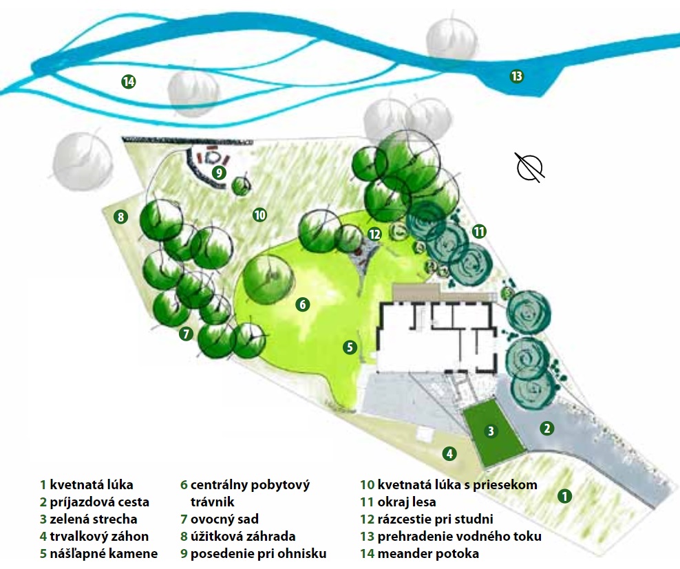 Z projektu možno vyčítať, že všetko sa premyslelo a do detailu aj prediskutovalo tak po stránke architektonickej, ako aj po stránke využitia flóry. Priestor s terasou prirodzene nadväzuje na centrálny pobytový trávnik, ďalej pokračuje kvetnatá lúka, ktorá prechádza do ovocného sadu až k okraju lesa. Zastaviť môžete pred úžitkovou záhradou s posedením pri ohni v tieni vysokého brestu.