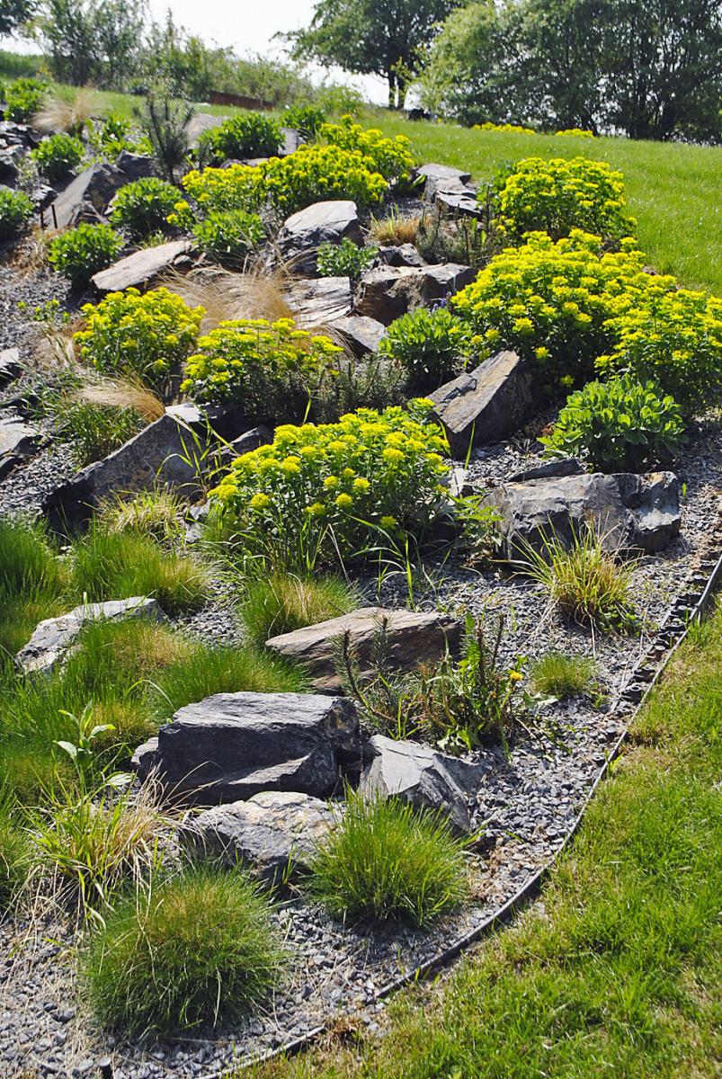 Na vstup do domu prepojený s terasou nadväzuje výsadba divokých trvalkových zmesí, ktoré ďalej smerom k príjazdovej ceste voľne prechádzajú do kvetnatej lúky. Zo zadnej strany domu vedie do záhrady ďalší prístup priamo do lesného spoločenstva, kde k existujúcim smrekom (Picea excelsior) a vysokému brestu vysadili ďalšie bresty (Ulmus minor). Podsadbu tvoria zmesi tieňomilných trvaliek lesného charakteru.