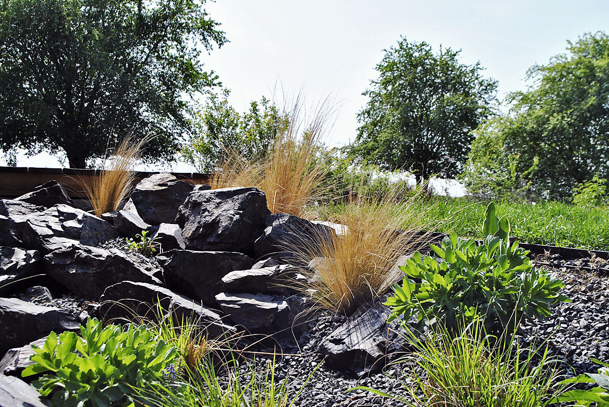 Strešnú záhradu pri dome sme už dokončili, vysadená je zmesou tráv tak, aby efekt výsadby pôsobil celú vegetačnú sezónu. S altánkom však treba chvíľu počkať,“ vysvetľuje David Horák a vedie nás cestou nášľapnými kameňmi smerom k chátrajúcej stavbe. „Stavba sa musí najprv rekonštruovať, na zachovalé múry nadviaže pergola a hore bude zelená strecha. Vďaka kamenným múrom a zelenej streche bude vnútri v letných mesiacoch príjemná mikroklíma,“ dodáva architekt.